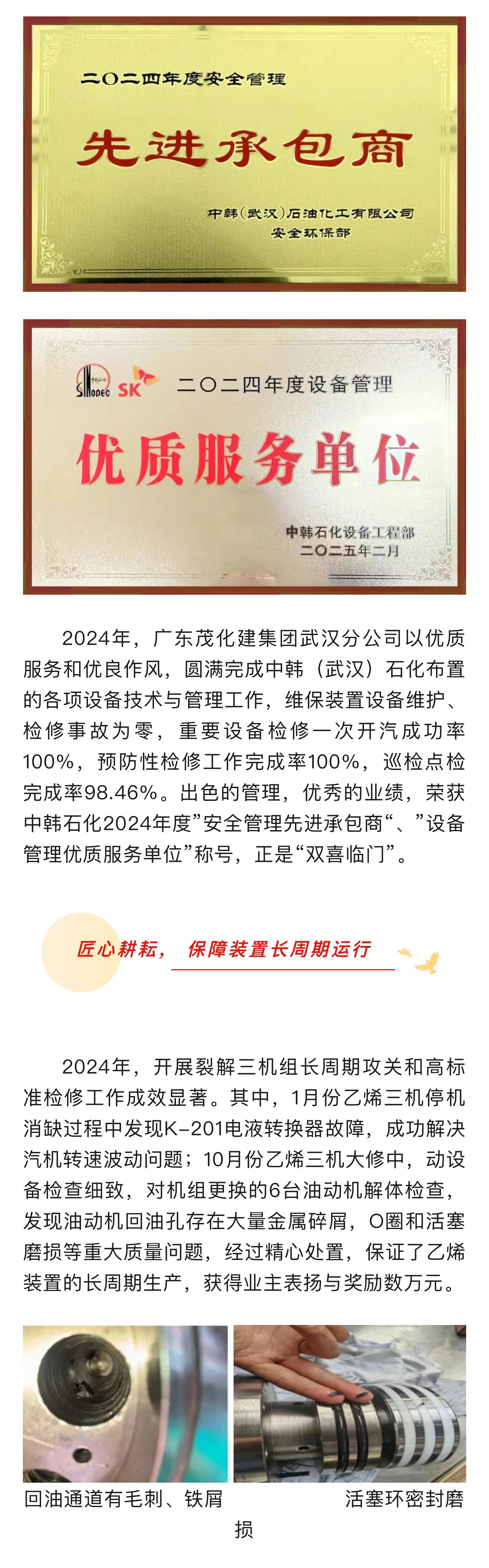 雙喜臨門(mén) | 武漢分公司榮獲2024年度中韓石化“安全管理先進(jìn)承包商”、“設(shè)備管
